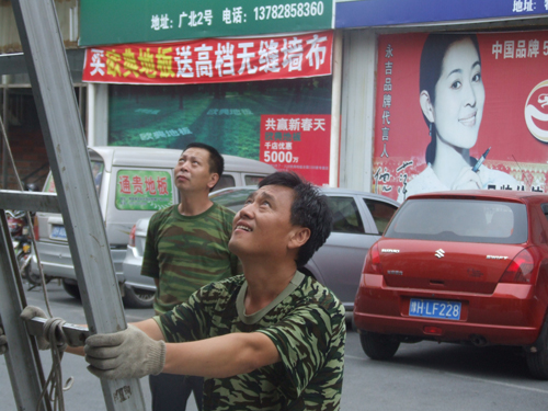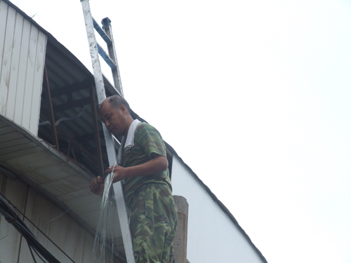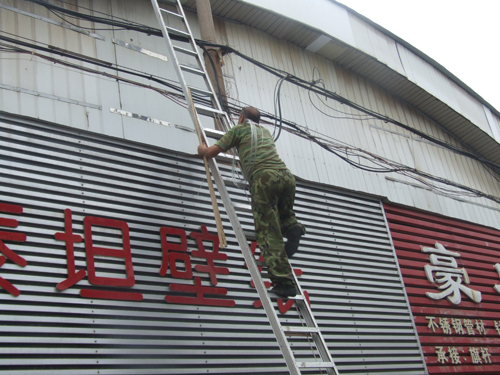 8月19日,大雨來臨之前,為保障物資城商戶的財產(chǎn)安全,后勤科頂著暴雨來臨之前的悶熱,將破損的大棚頂部及時維修完畢。