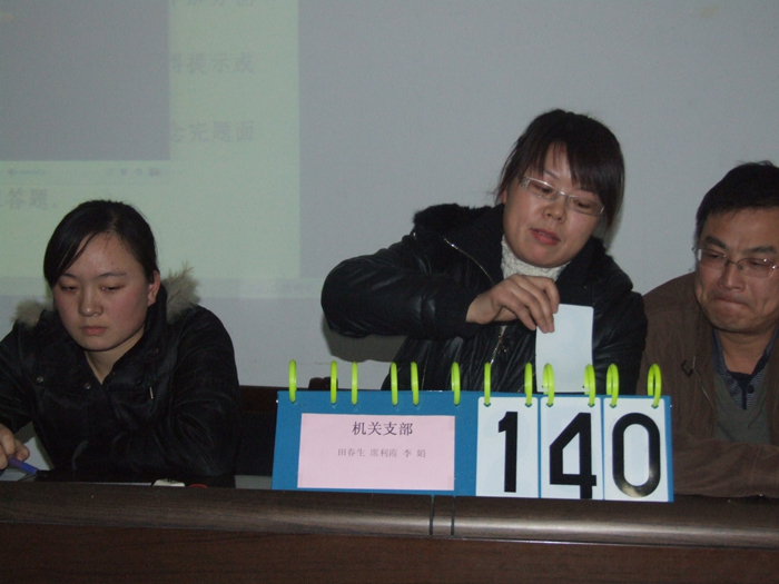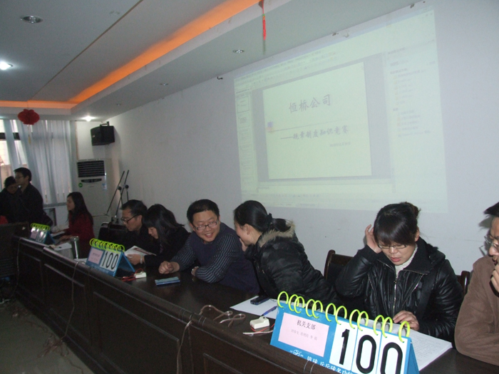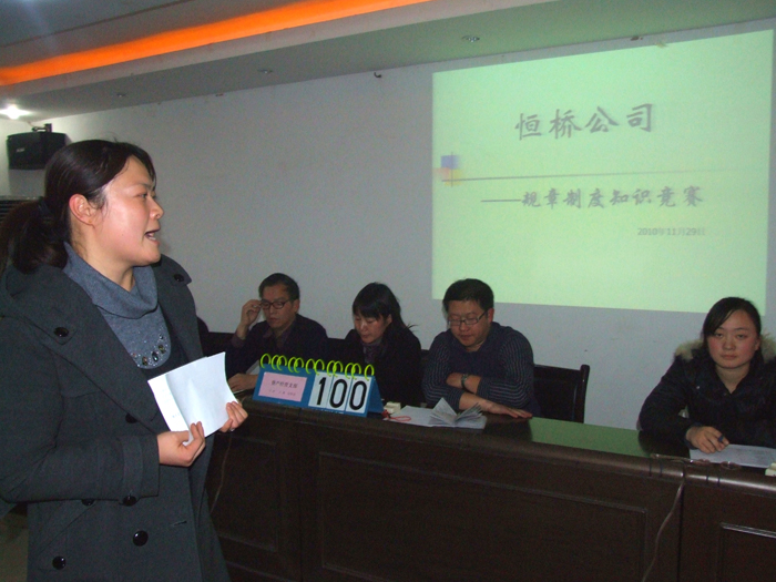 2010年11月29日下午5點,公司全體員工在物貿(mào)五樓會議室舉辦了“規(guī)章制度知識競賽”。機關(guān)、資產(chǎn)經(jīng)營、經(jīng)營后勤三個支部圍繞著公司規(guī)章制度的相關(guān)內(nèi)容展開了激烈角逐,經(jīng)過必答題、搶答題、觀眾必答題和風險題這四個環(huán)節(jié)的比拼,*終資產(chǎn)經(jīng)營支部贏得了本次競賽的**名。