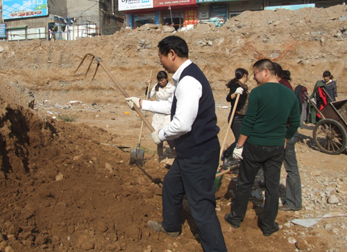 由于天氣逐漸降溫,為防止物資城東區(qū)施工工地的水管管道凍裂,11月1日公司副總經(jīng)理原躍作帶領(lǐng)物資城全體員工對暴露在外的管道進行回填土方勞動。