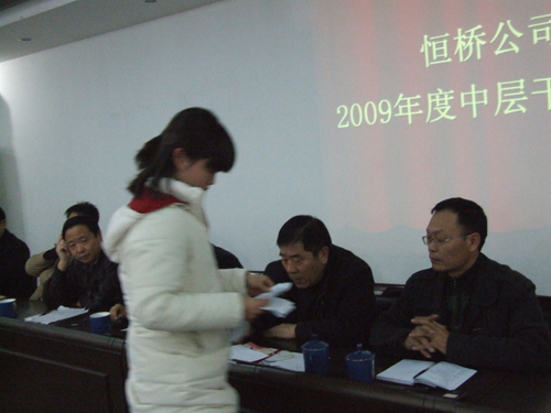 2009年12月3日,公司在物貿(mào)會議室召開本年度中層干部測評會。會議由監(jiān)事會主席姬中勝主持,物資局黨委副書記陳相如和政工科干事金靜蒞臨指導(dǎo)。 在公司15位中層干部對自己本年度的工作進(jìn)行述職后,全體員工對其予以評議打分。物資局陳書記對從公司長遠(yuǎn)發(fā)展出發(fā),大家以公正、客觀的心態(tài)認(rèn)真對中干打分的考核作法予以肯定。
